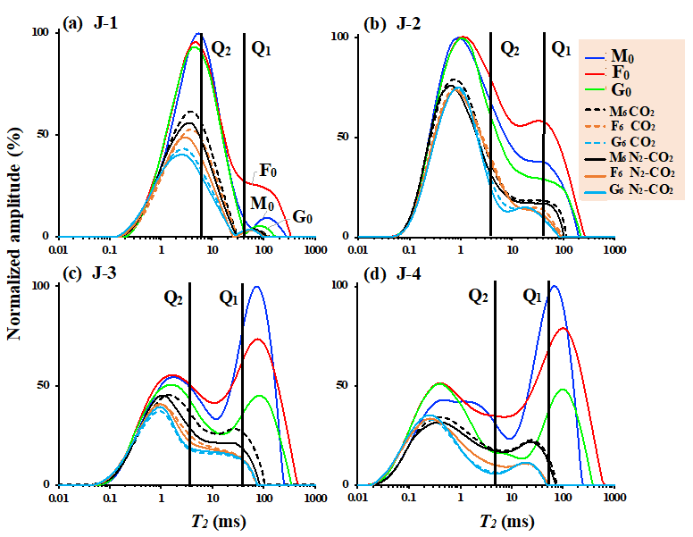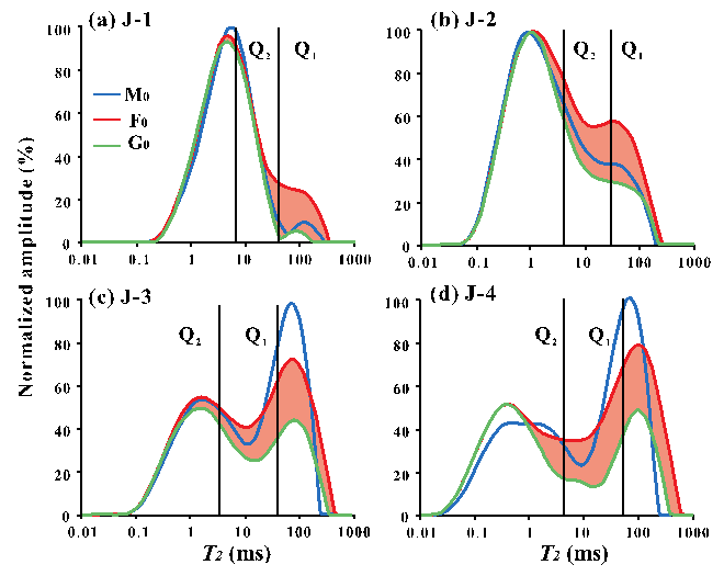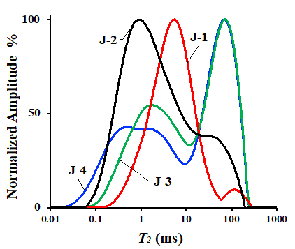 图2. 压裂前样品饱和轻油T2谱(J-1和J-2取自吉木萨尔凹陷,J-3和J-4取自西湖凹陷)