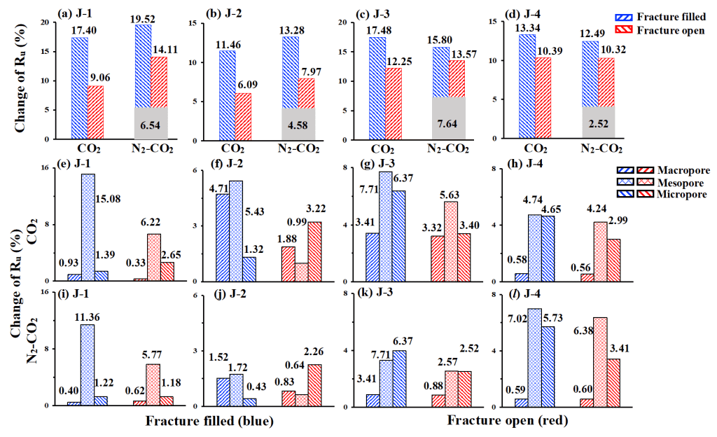 以压裂前M0采收率为基值,对比裂缝和气体组合下的增采量Ru(图6)。基质岩样M0注N2-CO2效果要好于纯CO2(灰色,Dong,2020a)。相比于纯CO2吞吐模式,压裂样品注N2-CO2在微孔发育岩样(J-1和J-2)中效果好,但在宏孔发育样品中效果差(J-3和J-4),推测与N2分子对小孔的弹性支撑作用有关。裂缝会存储大量气体,尤其是CO2,削弱气体在基质孔隙的扩散动能,使得总采出量下降(红色)。裂缝填充处理可以增大气体在基质孔隙中的波及效率,增大采收率(蓝色)。短期来看,造裂会大幅度提高产量;但缝的储气性对长期开发会产生不利影响。